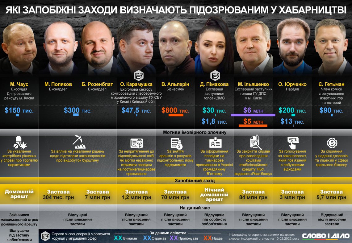 Бывшие народные депутаты Максим Поляков из «Народного фронта» и Борислав Розенблат от «Блока Петра Порошенко» являются фигурантами «янтарного дела», общая сумма полученных взяток, как сообщили в Национальном антикоррупционном бюро, составила $300 тыс. После задержания и Розенблата и Полякова отпустили под залог — 304 тыс. і 7 млн.