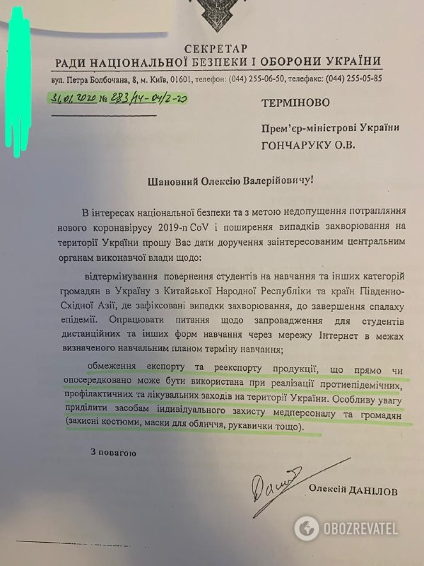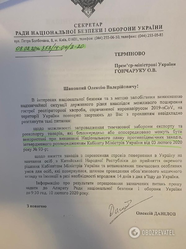 Сегодня с утра СМИ опубликовали два письма секретаря СНБО Алексея Данилова на имя премьера Алексея Гончарука. В обоих говорится, что ввиду надвигающейся эпидемии коронавируса нужно срочно прекратить экспорт медицинских масок, защитных костюмов и перчаток.