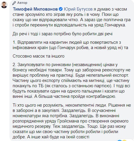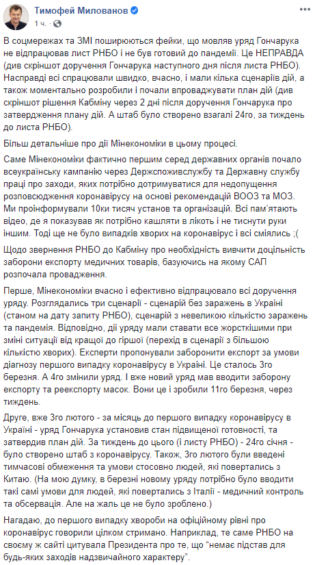 Милованов объяснил ситуацию так: «Эксперты предлагали запретить экспорт при условии диагноза первого случая коронавируса в Украини. Это произошло 3го марта. А 4го сменили правительство. И уже новое правительство должно было вводить запрет экспорта и реэкспорта масок. Они это и сделали 11го марта, через неделю».