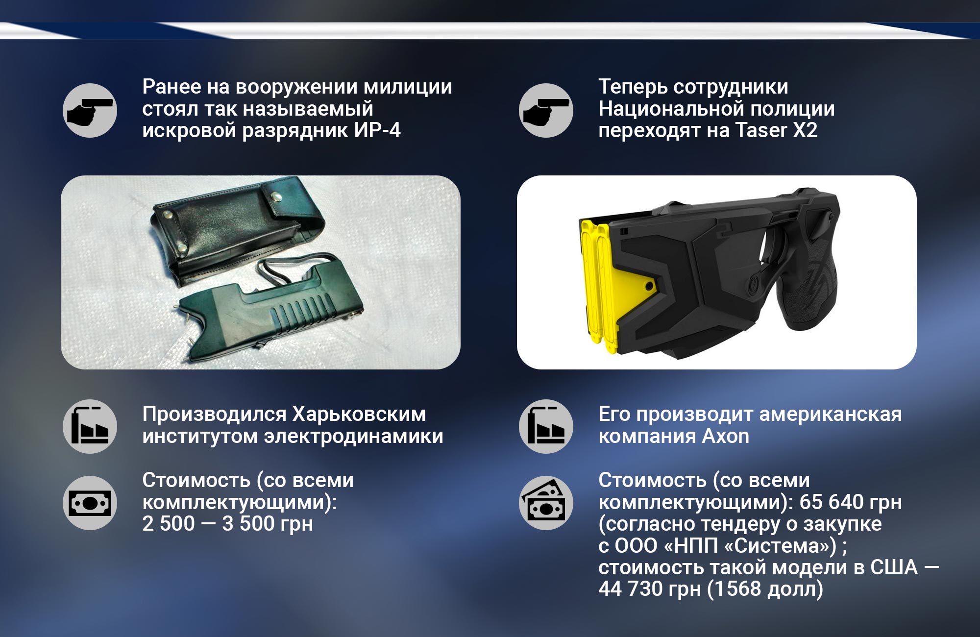 До проведения «правоохранительной реформы» в 2014 году милиционеры носили с собой так называемый искровой разрядник ИР-4, однако впоследствии такие электрошокеры не были приняты на вооружение. С тех пор, чтобы задержать убегающего от правосудия преступника, полицейским доводилось либо соревноваться с ним в беге, либо останавливать выстрелом из травматического оружия. Учитывая строгие инструкции по применению такой «меры принуждения», порой это заканчивалось не только ранением беглеца, но и смертью служителей правопорядка. Подобное произошло осенью 2016 года в Днепре, когда двое патрульных остановили за нарушение ПДД автомобиль: одного из них водитель убил, другого — смертельно ранил, а сам, получив пулю в живот, уехал с места преступления.