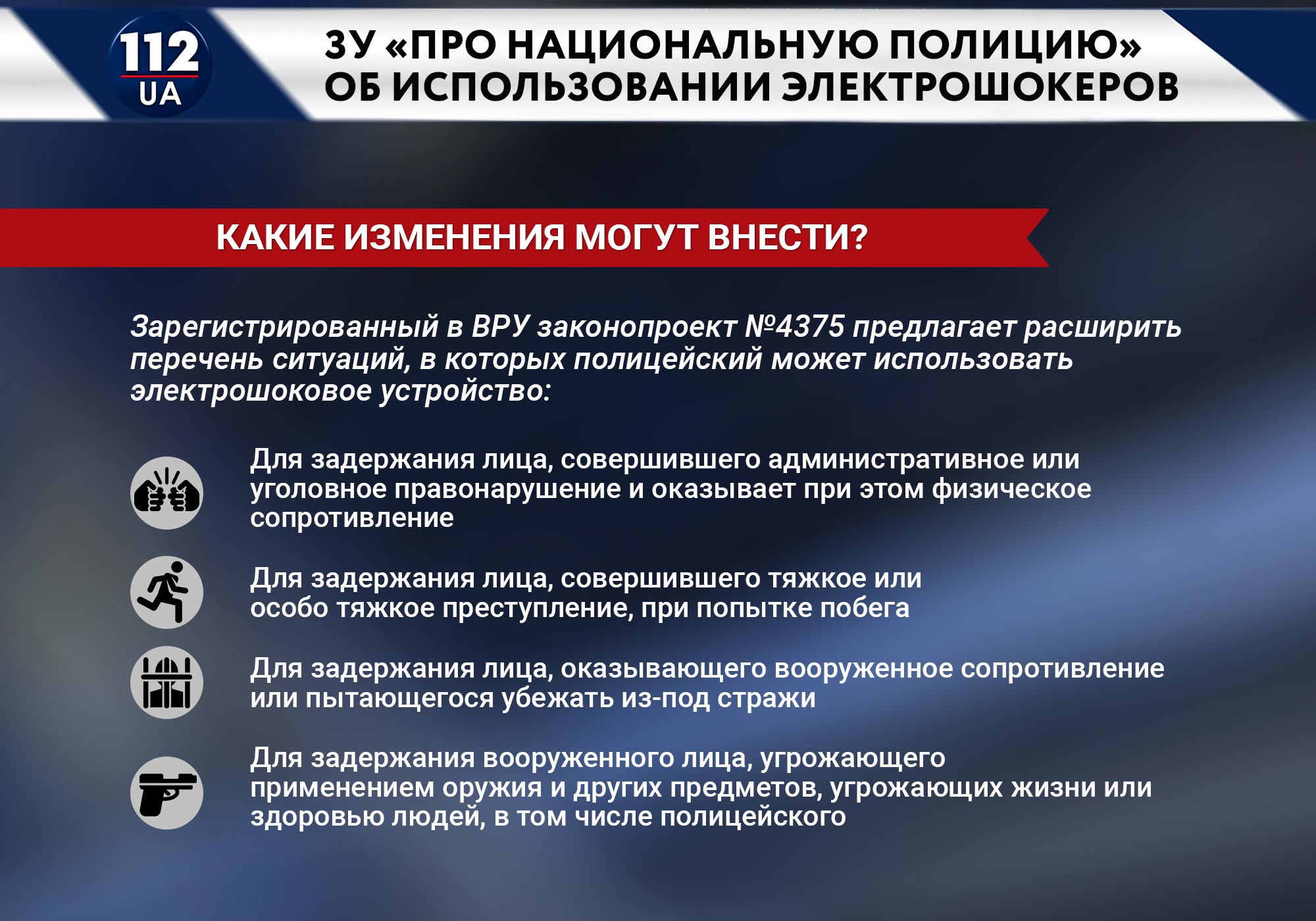 Стремясь не отставать от «европейской моды» на принципы работы полицейских, в МВД решили расширить этот перечень и зарегистрировали в парламенте соответствующий законопроект № 4375. Изменения заставят правонарушителей разрабатывать новые тактики побега и сопротивления, ведь использование электрошокеров имеет менее строгую процедуру.