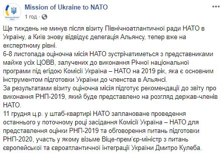 «6-8 ноября оценочная миссия НАТО встретится с представителями почти всех центральных органов исполнительной власти, привлеченных к выполнению Годовой национальной программы под эгидой комиссии Украина – НАТО на 2019 год«, – заявили дипломаты, назвав ГНП основным инструментом подготовки страны к членству в альянсе.