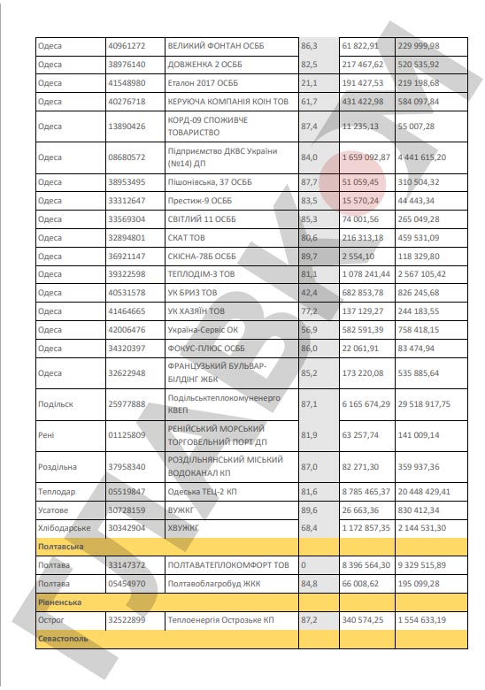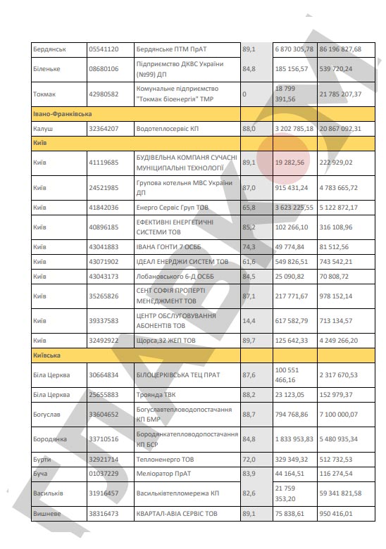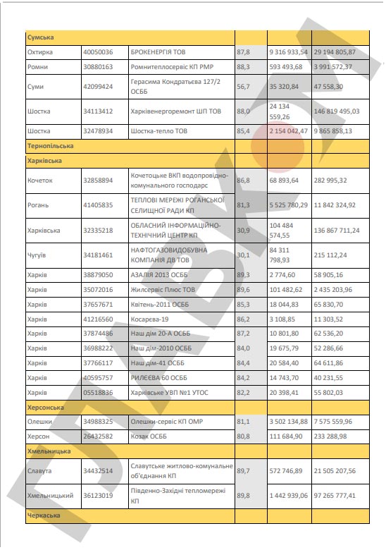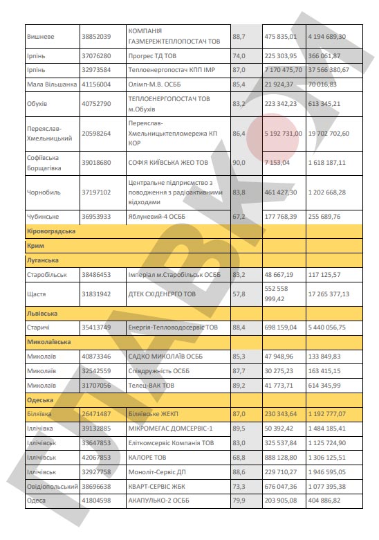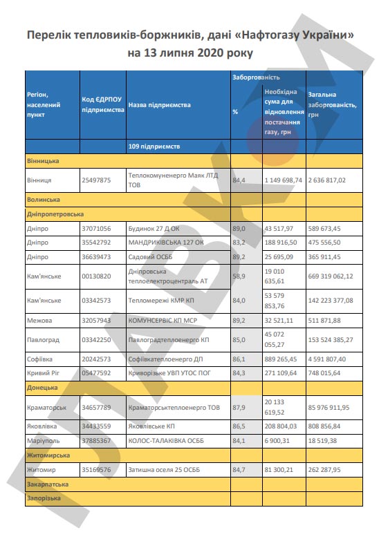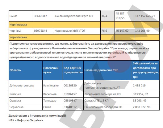 Кроме того, НАК обнародовал перечень предприятий, которые не выполняют договоры о реструктуризации задолженности, заключенные с «Нафтогазом» во исполнение Закона от 2016 года № 1730 «О мерах, направленных на урегулирование задолженности теплоснабжающих и теплогенерирующих организаций и предприятий централизованного водоснабжения и водоотведения за потребленные энергоносители».