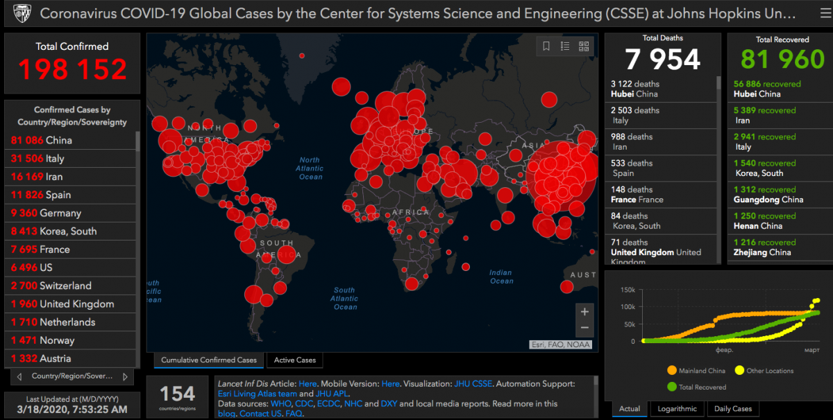 Общее число зараженных коронавирусом COVID-19 в мире по состоянию на утро 18 марта возросло до 198 152 человек, при этом общее число смертей составило уже 7954. Об это свидетельствую данные Центра системных исследований и инжиниринга при Университете Джона Хопкинса.