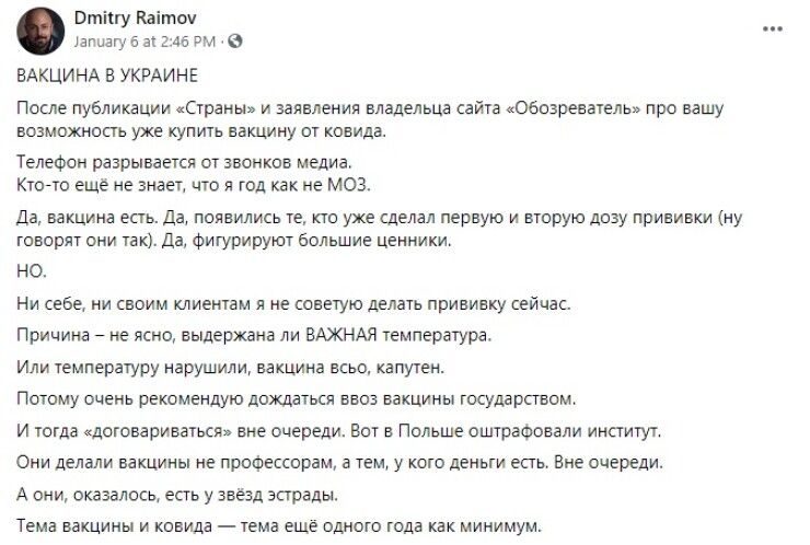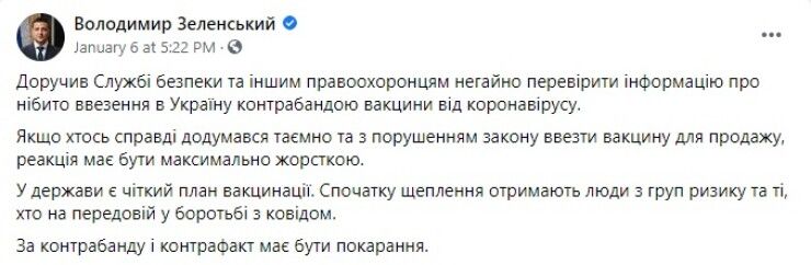 На следующий день, 6 января, президент Владимир Зеленский, который укатил в Буковель кататься на лыжах, но держал руку на пульсе происходящего, написал в Facebook, что поручил СБУ и прочим правоохранителям расследовать дело о нелегальных поставках вакцины. «Если кто-то действительно додумался тайно и с нарушением закона ввезти вакцину для продажи, реакция должна быть максимально жесткой», — написал Зеленский.