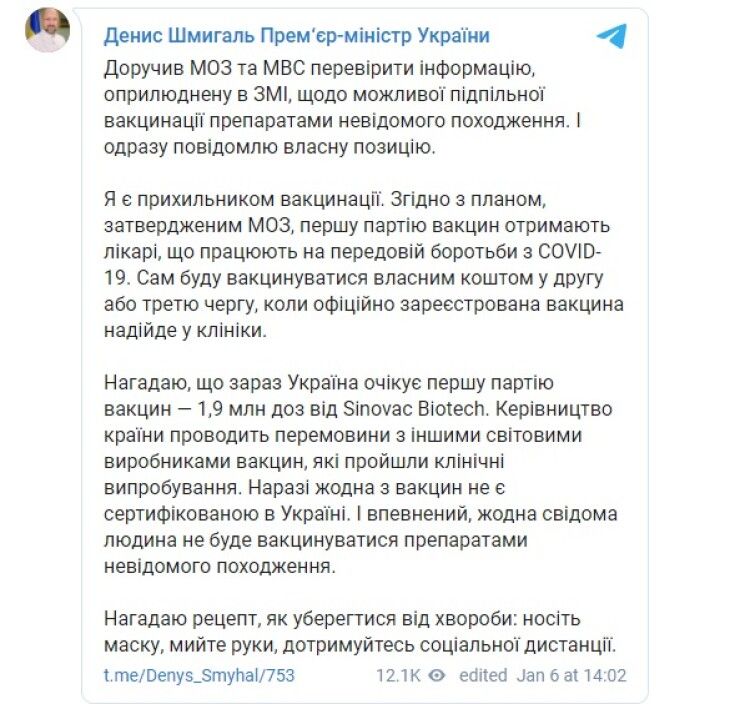 Премьер-министр Денис Шмыгаль также прокомментировал слухи и отметил, что уже поручил Минздраву и МВД проверить появившуюся в СМИ информацию.