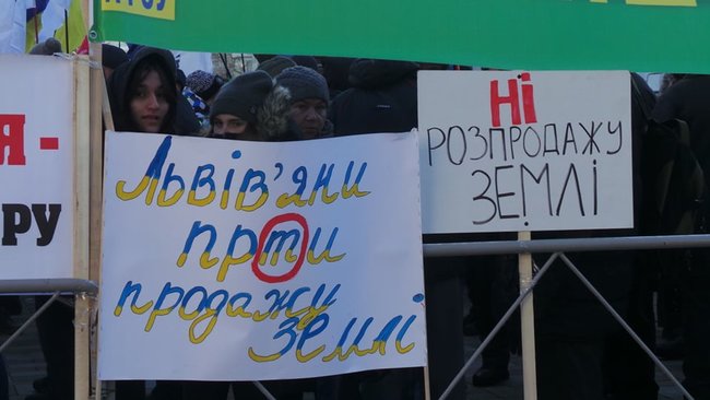 Митингующие развернули плакаты и банеры против открытия рынка земли. Также они держат флаги с партийной символикой.
