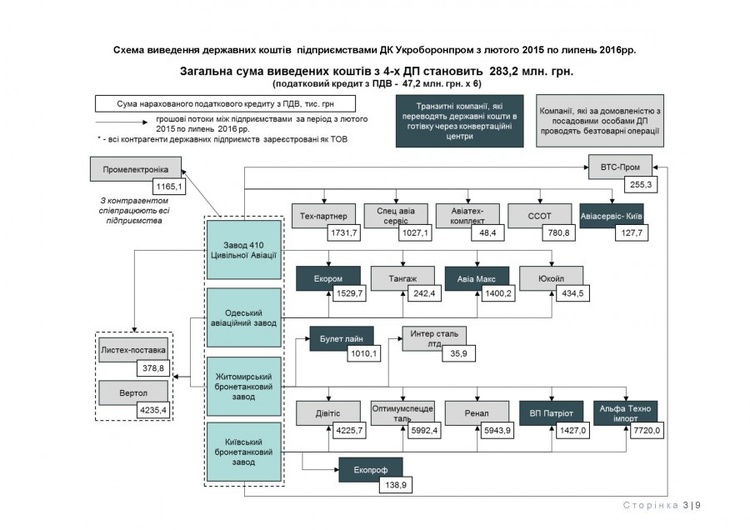 Как установили следователи Шевченковского управления полиции ГУНП в г. Киеве, только четыре предприятия концерна «Укроборонпром» – ГП «Житомирский бронетанковый завод», ГП «Киевский бронетанковый завод», ГП «Одесский авиационный завод» и ГП «Завод 410 гражданской авиации» через фиктивные «ооошки» и с завышением объемов налогового кредита заключили договоры на поставку фейковых услуг, работ и товаров на общую сумму 283 200 000 грн.