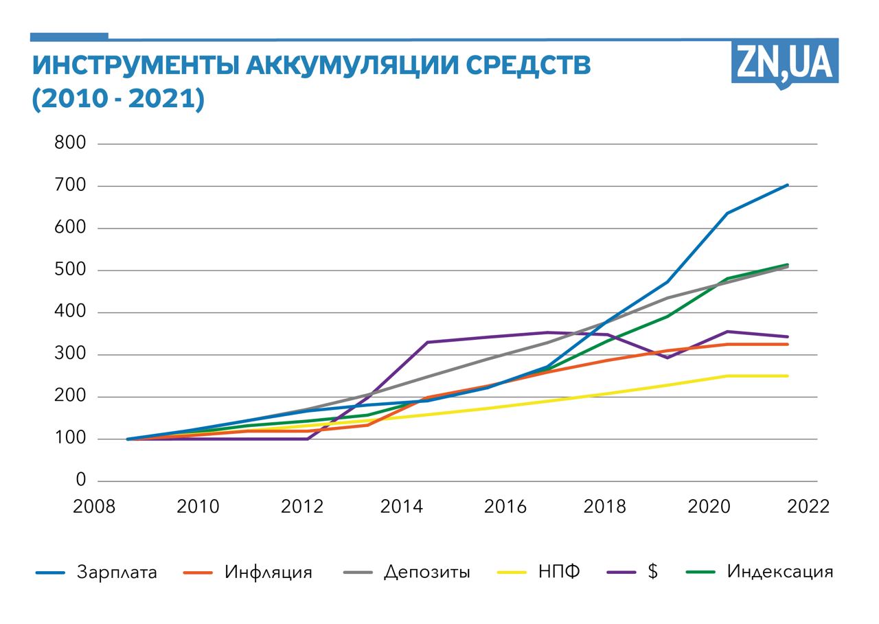 Анализ реальных результатов таких вложений на протяжении десятилетия, с 2010-го по 2021 год, показывает интересную тенденцию (см. рис.). Так, при аккумулированной инфляции за эти годы в 3,25 раза вложения в негосударственные пенсионные фонды ожидаемо показали наихудший результат, который даже не покрывает уровня инфляции, — 2,5. Простая замена гривни на валюту приумножила номинальные средства в 3,43 раза. Банковский депозит позволил аккумулировать средства на уровне 5,09. За это время средняя зарплата выросла в 7,01 раза. А именно она заложена в расчет пенсии. То есть в случае добровольных взносов на пенсионное страхование, предусмотренное статьей 12 базового Закона «Об общеобязательном государственном пенсионном страховании», результат аккумуляции средств выглядит наиболее привлекательным.