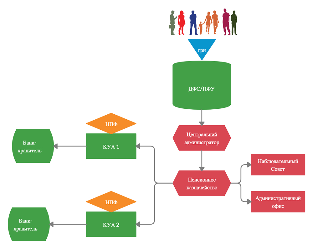 Как видим, при такой структуре взносы формируются физическими лицами и компаниями, через государственный казначейский счет поступают и контролируются ДФС и ПФУ, далее средства направляются центральному администратору, который обеспечивает персонифицированный учет и обслуживание клиентов, управляет пенсионными выплатами, ведет бухгалтерский учет и ежедневно начисляет клиентам доходность.