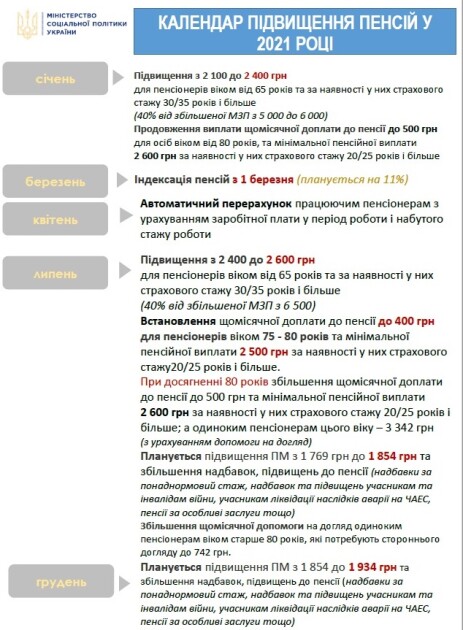Наиболее защищенными будут пенсионеры, которые имеют полный страховой стаж. Так, у лиц старше 65 лет, имеющих страховой стаж 30 лет (женщины) и 35 лет (мужчины), минимальная пенсионная выплата в течение 2021 г. вырастет на 500 грн, они будут получать не менее 2600 грн. Также продолжится программа доплат для пенсионеров старше 80 лет, имеющих страховой стаж 20/25 лет, и начнется программа для пенсионеров старше 75 лет с полным стажем.