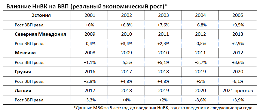 Как видим, полученные данные демонстрируют разнонаправленные тренды. Но нужно учитывать два момента. Первый: показатель ВВП подвергается сложнейшему многофакторному воздействию, и выделить влияние отдельно взятого налога весьма проблематично, если вообще возможно. Второй момент: к введению НнВК прибегали как к разумной реакции на экономический кризис (Мексика, Македония, Польша), а данные по Грузии и Латвии за 2020 год в значительной мере искажены экономическими последствиями пандемии COVID-19. В любом случае на сегодняшний день нет четких доказательств того, что НнВК не способствует или, тем более, ущемляет рост экономики.