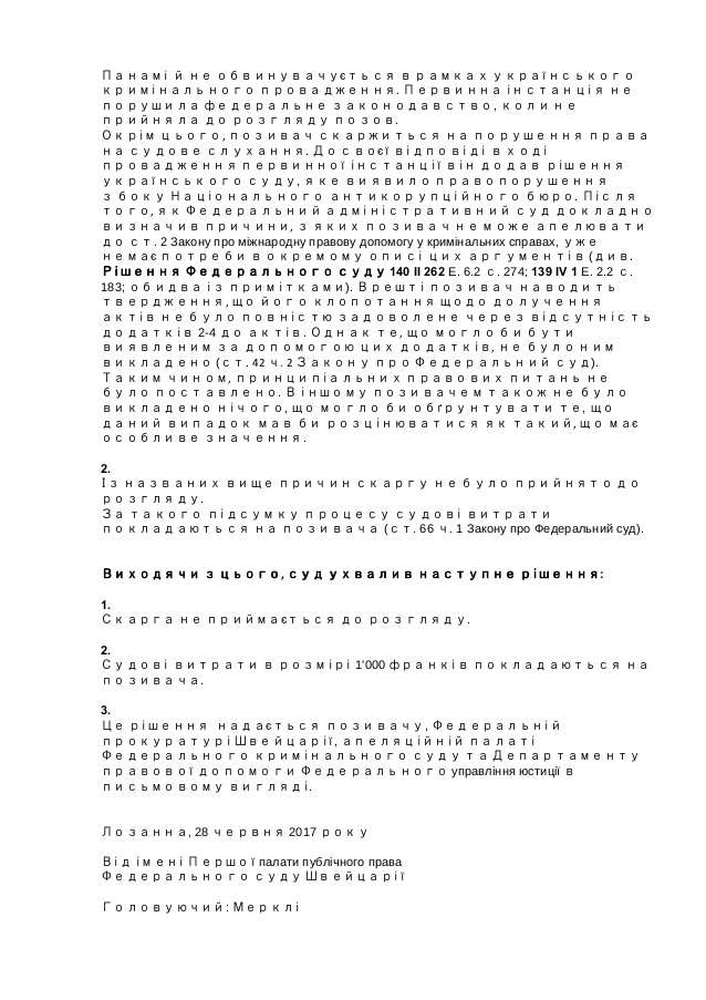 Речь идет о решении Федерального уголовного суда Швейцарии. Эти решения являются публично доступными на немецком языке, и Центр противодействия коррупции решил их перевести. Они абсолютно признают право украинского НАБУ на международное сотрудничество.