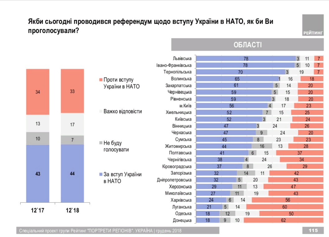 Резко отрицательно к идее вступления отнеслись в Восточном и Южном регионах страны. Абсолютное большинство против в Донецкой, Одесской, Луганской и Харьковской областях.