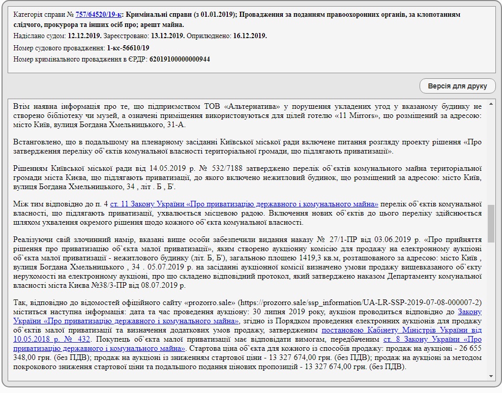 В материалах дела указано, что 4 июля 2019 года ГСУ Нацполиции в ЕРДР под №12019000000000602 были внесены сведения об открытии уголовного производства, предусмотренного тремя статьями Уголовного кодекса Украины: