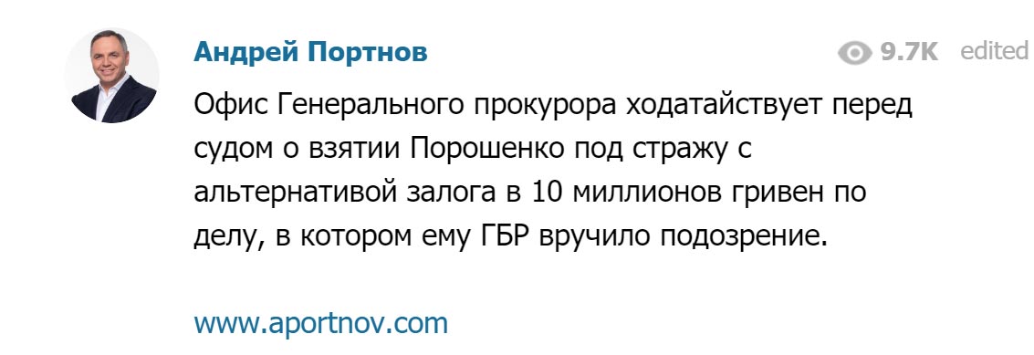«Офис генерального прокурора ходатайствует перед судом о взятии Порошенко под стражу с альтернативой залога в 10 миллионов гривен по делу, в котором ему ГБР вручило подозрение», — написал он.