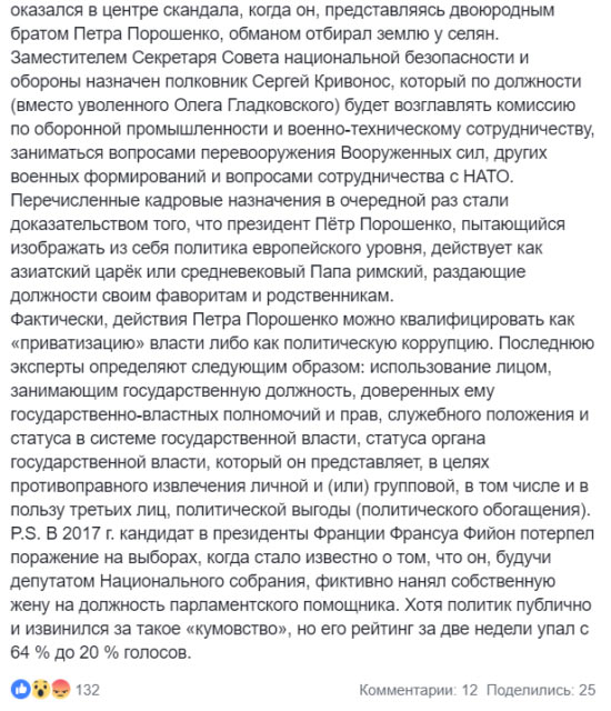 «Перечисленные кадровые назначения в очередной раз стали доказательством того, что президент Пётр Порошенко, пытающийся изображать из себя политика европейского уровня, действует как азиатский царёк или средневековый Папа римский, раздающий должности своим фаворитам и родственникам», — пишет политолог. По его словам, действия гаранта квалифицируются как приватизация власти или как политическая коррупция.