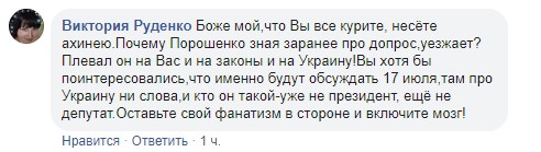 «Его туда пригласили как представителя Украины? Или он так сам решил. Спасать то что прокакал за 5 лет? Ребята! О чем вы? Он себя назначает кем то. Сам себе президент. Это смешно. За памперсами поехал. У нас уже нет больших размеров. Попередники все выкупили. Вы только узнали, он сбежал еще 2 месяца назад.Только каким то образом все время в Украине. странно»; «Неужели выпустили? Да кто его может сегодня задержать? Пограничники его и Гройсман пока что»; «Боится, значит чувствует за собой грехи, ничего, рано или поздно всё равно ответит за них»; «Почему Порошенко зная заранее про допрос,уезжает? Плевал он на Вас и на законы и на Украину!Вы хотя бы поинтересовались, что именно будут обсуждать 17 июля, там про Украину ни слова,и кто он такой-уже не президент, ещё не депутат. Оставьте свой фанатизм в стороне и включите мозг!»; «Порош сделал людей нищими, в тюрьму его — туда ему дорога, для страны и людей ничего не сделал. И чего он гасает, ни один прежний президент себя так не вел, вор должен сидеть в тюрьме»; «Если есть повестка, пограничники имеют право не выпускать из страны».