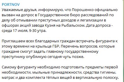 «Уважаемые друзья, информирую, что Порошенко официально вызван на допрос в Государственное бюро расследований по делу об отмывании преступных доходов и легализации в офшорах акций завода «Кузня на Рыбальском», — пишет Портнов. Он уточняет, что дата допроса — среда 17 июля, 09:30 утра.