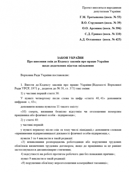 Так, в новом трудовом законодательстве работодатель сможет расторгнуть контракт/договор с сотрудником по причинам, по которым ранее этого сделать не мог. Речь идет о проекте закона № 2584 «О внесении изменений в Кодекс законов о труде Украины относительно дополнительных оснований для увольнения». Документ авторства группы нардепов, как указано на сайте Верховной Рады, прошел рассмотрение Комитета и сейчас предоставлен для ознакомления.