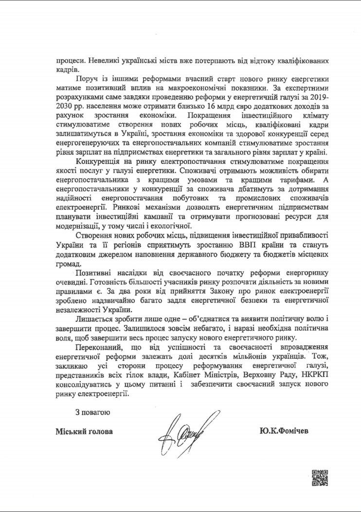 Мэр города Славутич (Киевская область) Юрий Фомичев заявил, что от своевременного внедрения энергетической реформы зависят судьбы десятков миллионов украинцев. Об этом Фомичев сообщил в своем письме на имя вице-премьер-министра Владимира Кистиона, председателя профильного комитета по вопросам топливно-энергетического комплекса (ТЭК) Верховной Рады Украины Александра Домбровского и председателя Национальной комиссии, осуществляющей государственное регулирование в сферах энергетики и коммунальных услуг (НКРЭКУ) Оксаны Кривенко, сообщают «Українські новини»