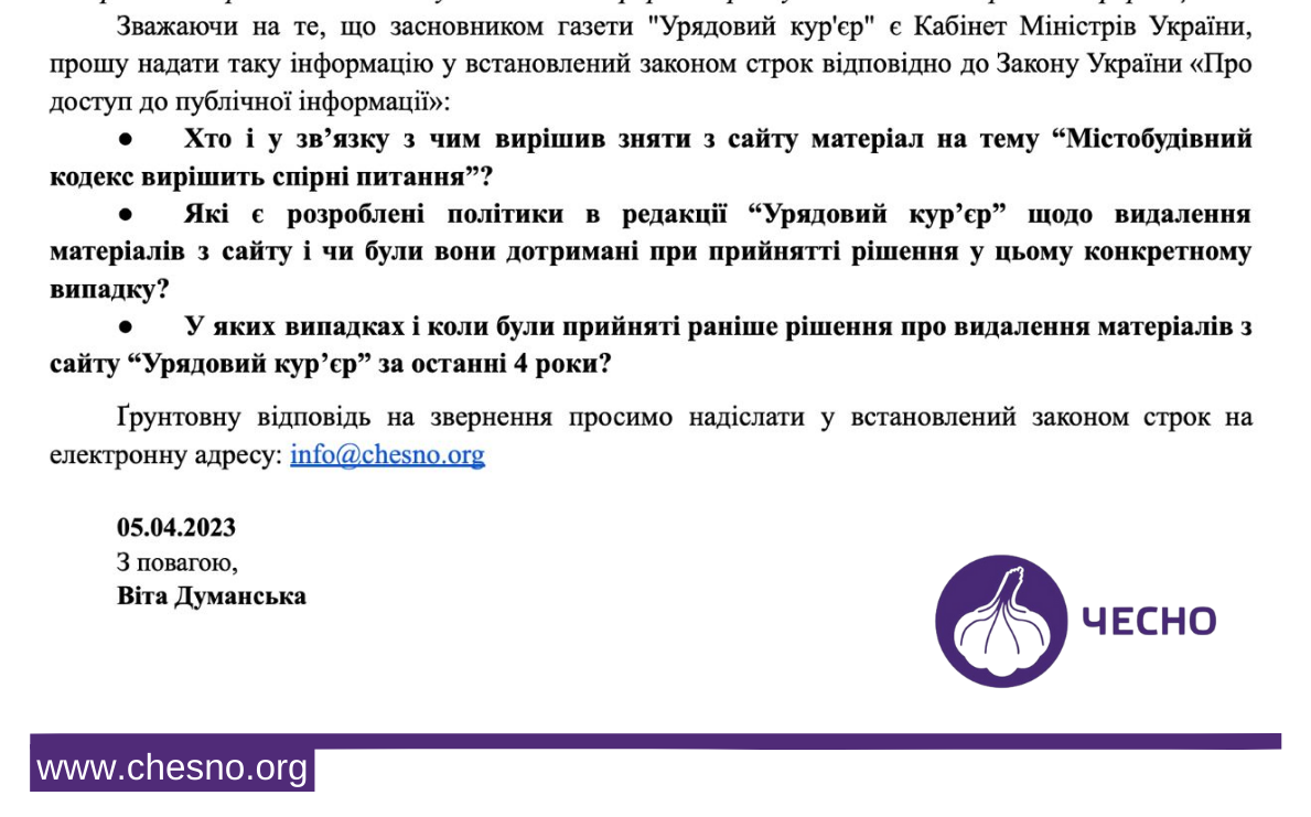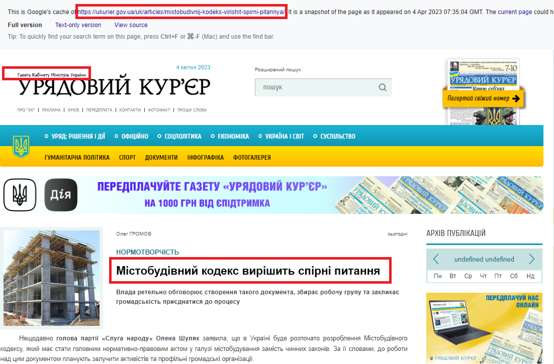 4 апреля ежедневная газета Кабмина «Правительственный курьер» опубликовала статью о Градостроительном кодексе, однако уже к вечеру материал без объяснений удалили из ресурса. Об этом сообщает Движение «Честно».
