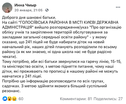 В Киеве уже разразился скандал с одним из самых популярных лицеев — «Голосеевским» №241. Поступление в этот лицей в предыдущие годы сопровождалось большим ажиотажем. На форумах можно прочесть даже о том, что люди нарочно покупали жилье на территории обслуживания этого учебного заведения, чтобы зарегистрировать там детей и таким образом гарантировать им поступление в этот лицей.