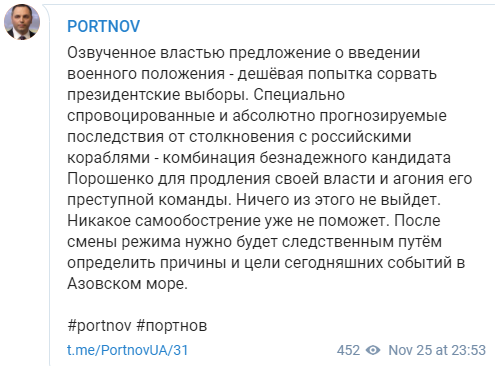 «Озвученное властью предложение о введении военного положения — дешевая попытка сорвать президентские выборы. Специально спровоцированные и абсолютно прогнозируемые последствия от столкновения с российскими кораблями — комбинация безнадежного кандидата Порошенко для продления своей власти и агония его преступной команды. Ничего из этого не выйдет. Никакое самообострение уже не поможет. После смены режима нужно будет следственным путем определить причины и цели сегодняшних событий в Азовском море» — написал Портнов.