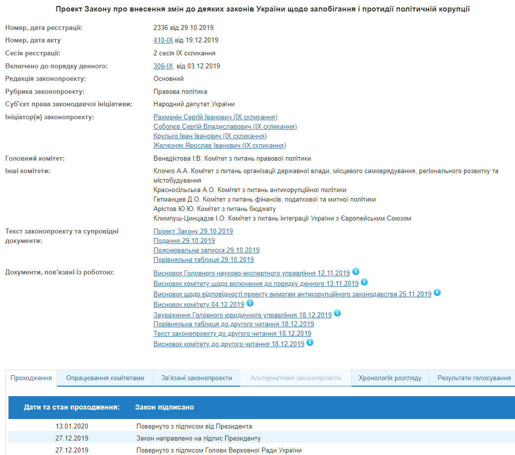 Президент Украины Владимир Зеленский подписал законопроект №2336 «О внесении изменений в некоторые законы Украины о предотвращении и противодействии политической коррупции«. Об этом свидетельствует информация на сайте Верховной рады.