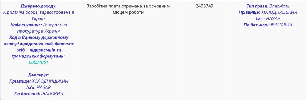 Директор Специализированной антикоррупционной прокуратуры Назар Холодницкий — миллионер. Причем сколотить целое состояние ему удалось на одной лишь зарплате. Так в 2018 году, согласно поданной главным антикоррупционным обвинителем декларации, его зарплата составила 2,4 млн грн. При этом на счетах у главы САП размещены 1,314 млн гривен, 164 тыс. долларов США и 34 тысячи евро. Таким образом, сбережения Холодницкого в гривневом эквиваленте равны 6,221 млн гривен.