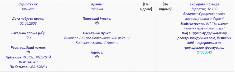 За время своей работы в антикоррупционной прокуратуре он обзавелся лишь небольшим гаражом на Софиевской Борщаговке. При этом, в собственности у него есть квартира в Вишневом в 61 квадратный метр и два участка земли в пригороде Киева, с. Белогородка 1000 и 1200 м2. Также с 2008 года Холодницкий снимает 17-метровую комнату в Вишневом..