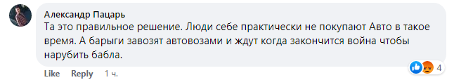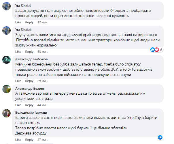 «Да, это правильное решение. Люди себе практически не покупают авто в такое время. А барыги завозят автовозами и ждут, когда закончится война, чтобы нарубить бабла», … «Закончился бизнес автобарыгам», … «Правильно! Потому что некоторые очень хитрые уже нагнали машин и забивают склады товаром. Но хоть копейку на армию выделили? Нет», – пишут украинцы.