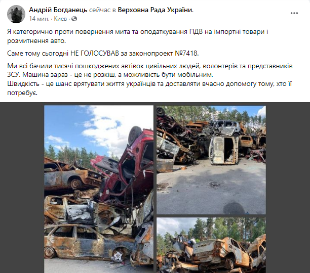 «Я категорически против возврата пошлин и налогообложения НДС на импортные товары и растаможку авто. Именно поэтому сегодня не голосовал за законопроект №7418. Мы все видели тысячи поврежденных автомобилей гражданских людей, волонтеров и представителей ВСУ. Машина сейчас – это не роскошь, а возможность быть мобильным. Скорость — это шанс спасти жизнь украинцев и вовремя доставлять помощь тому, кто в ней нуждается», — считает нардеп.