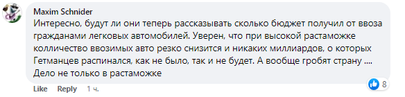 «Интересно, будут ли они теперь рассказывать, сколько бюджет получил от ввоза гражданами легковых автомобилей. Уверен, что при высокой растаможке количество ввозимых авто резко снизится и никаких миллиардов, о которых Гетманцев распинался, как не было, так и не будет. А вообще гробят страну. Дело не только в растаможке», – пишет Максим Шнайдер.