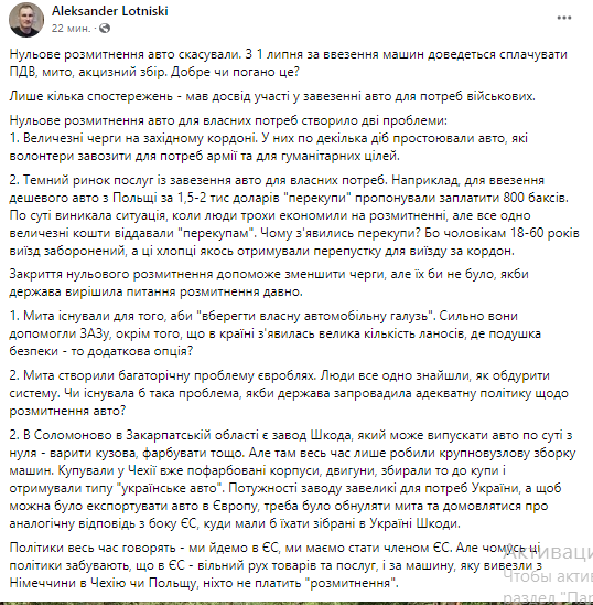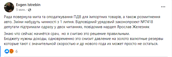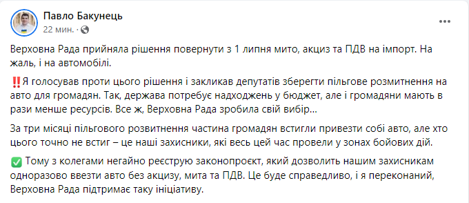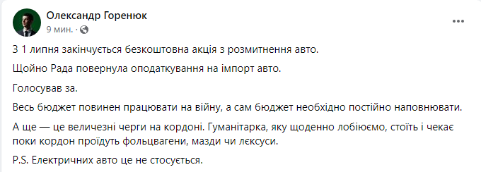 «С 1 июля заканчивается бесплатная акция по растаможке авто. Только что Рада вернула налогообложение на импорт авто. Голосовал «за». Весь бюджет должен работать на войну, а сам бюджет нужно постоянно наполнять. А еще – это огромные очереди на границе. Гуманитарка, которую ежедневно лоббируем, стоит и ждет, пока границу проедут «фольцвагены», «мазды» или «лексусы», – пишет нардеп.