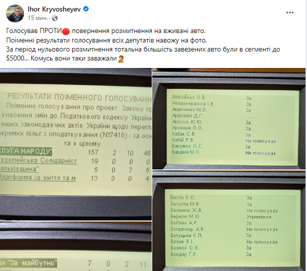 «Голосовал против возвращения растаможки на подержанные авто. За период нулевого растаможивания тотальное большинство ввезенных авто было в сегменте до $5000… Кому-то они мешали», — отмечает нардеп от «Слуги народа» Игорь Кривошеев.