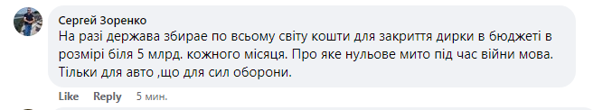 В настоящее время государство собирает по всему миру средства для закрытия дыры в бюджете в размере около 5 млрд. каждого месяца. О какой нулевой пошлине во время войны идет речь. Только для авто, что для сил обороны», — добавляет Сергей Зоренко.