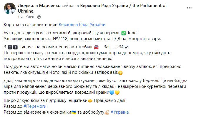 «Была долгая дискуссия с коллегами и здравый смысл победил. Приняли законопроект №7418, возвращаем таможенную пошлину и НДС на импортные товары. Во-первых, это отменит коллапс на границе, когда гуманитарная помощь, которую ожидают пострадавшие, стоит неделями в очереди из-за ввоза автомобилей. Во-вторых, мы автоматически снимаем вопросы злоупотребления ввоза автомобилей, ведь все прекрасно знают, какая ситуация есть и кто, какие и по сколько автомобилей ввез. Далее законопроект возобновляет налогообложение, которое было отменено в марте. Это необходимая мера для наполнения государственного бюджета и ликвидации чрезмерного конкурентного преимущества против производимой внутри страны продукции«, – объясняет народная депутат.