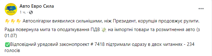 «Автоолигархи оказались сильнее, чем президент, коррупция продолжает рулить», – пишет общественная организация на своей странице в Facebook.