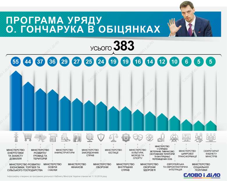 В целом программа Кабмина содержит 383 обещания. Больше всего намерений и планов зафиксировано за Министерством энергетики и защиты окружающей среды – 55 обещаний. Второе место по количеству задач занимает Министерство развития экономики, торговли и сельского хозяйства, которое должно выполнить 44 обещаний правительства. На третьем месте – Министерство развития общин и территорий (37 обещаний).