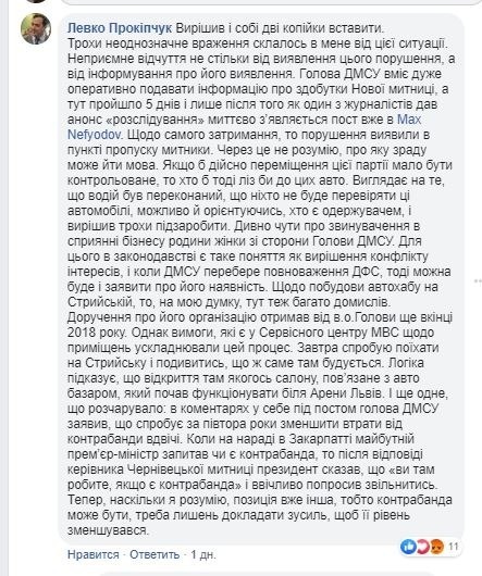 Спустя ровно час, в 12:50, Максим Нефьодов выдал пост о том, что 10 числа на Краковце задержали автовозы с товарной контрабандой.