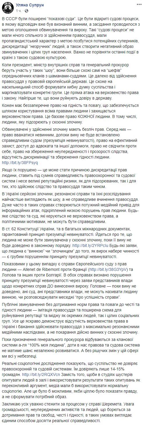 Публичные обвинения без соблюдения норм права и уважения чести и достоинства человека — имитация правосудия и распространенная схема для разрушения репутации и имиджа как отдельных людей, так и целых социальных групп», — подчеркивает Супрун. По ее мнению, все это «ярко демонстрирует отсутствие верховенства права в Украине и желание осуществлять правосудие с максимально резонансными медийными последствиями, а не наказание действительно виновных в совершении преступления».