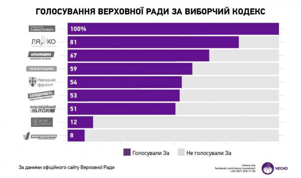 Верховная Рада приняла во втором чтении и в целом новый Избирательный кодекс Украины, который предусматривает введение пропорциональной избирательной системы с открытыми списками партий при выборах народных депутатов Украины с проходным барьером в 5%. За соответствующее решение проголосовали 230 депутатов.