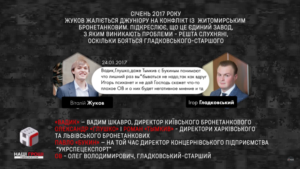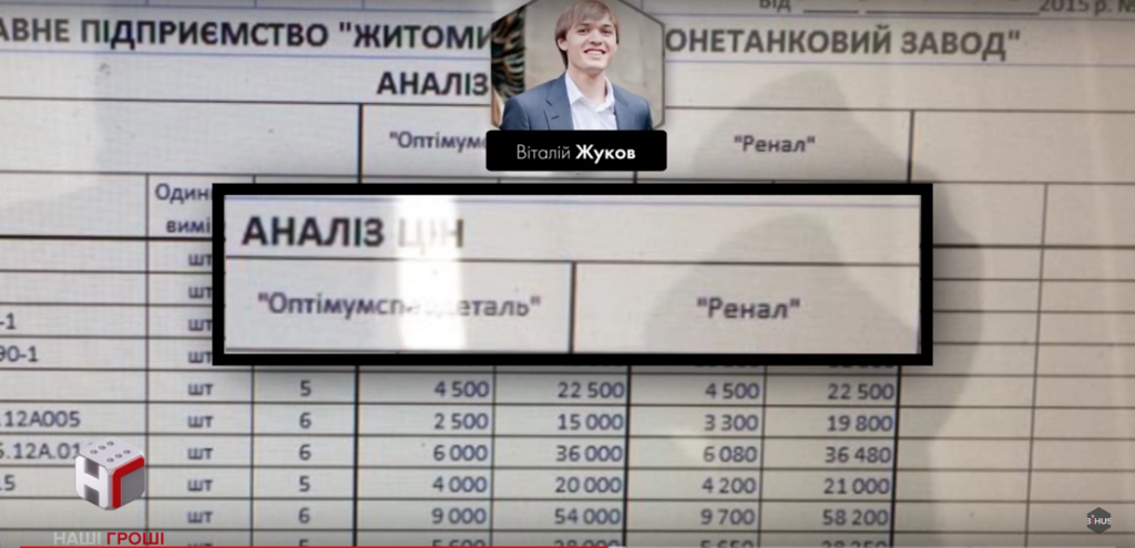 Кроме того, конкурс на закупку только имитировали. «Житомирский бронетанковый завод», к примеру, проводил конкурс между двумя компаниями-прокладками, принадлежащими Виталию Жукову: «Оптимумспецдеталь» и «Ренал».
