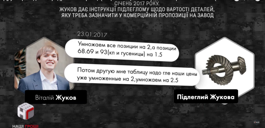 Так, расследователи располагают перепиской между участниками аферы. Один из них, Виталий Жуков, распорядился, чтобы цену на необходимые для украинской армии комплектующие сперва умножали на 2, а потом еще на 2.5.