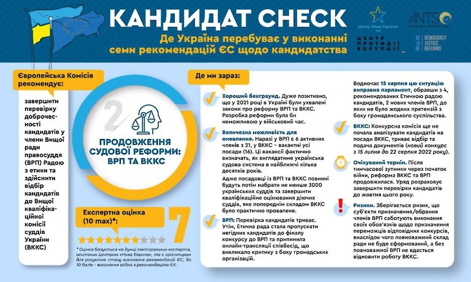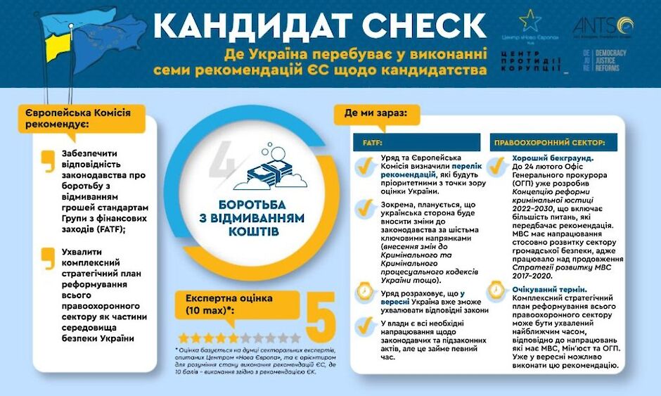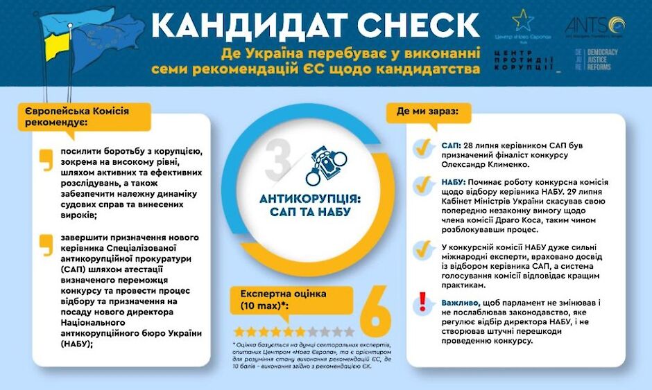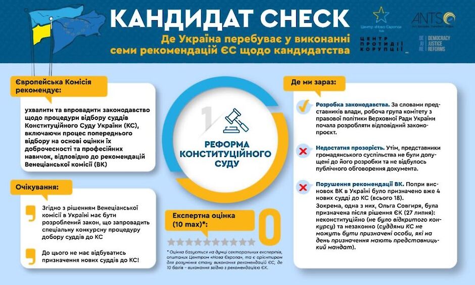 Центр «Новая Европа» в партнерстве с Центром противодействия коррупции (ГПК), Сетью защиты национальных интересов (АНТС) и Фундация DEJURE совершили кандидат-check – первый независимый мониторинг выполнения Украиной рекомендаций ЕС.