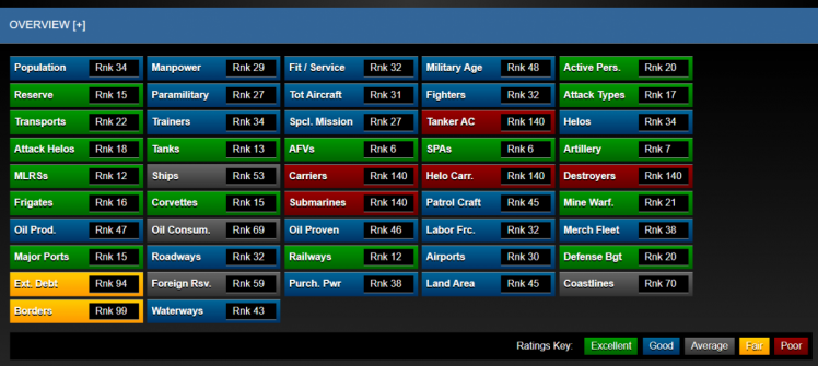 Человеческий ресурс является одним из ключевых показателей. Чем в стране больше людей, тем лучше ее потенциал в работе на оборону и военную индустрию. Ну и, соответственно, больше военных кадров в армии и резерве. Также наиболее важными являются показатели Воздушных сил, ВМС и бронетехники.