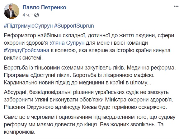 Петренко решительно поддержал Супрун, назвав ее «коллегой, которая впервые за историю страны бросила вызов системе».