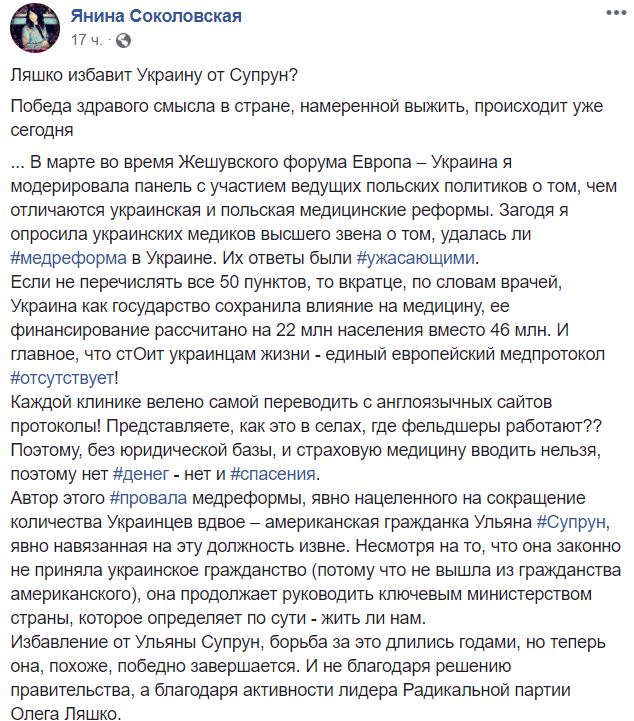 «Избавление от Ульяны Супрун, борьба за это длилась годами, но теперь она, похоже, победно завершается. И не благодаря решению правительства, а благодаря активности лидера Радикальной партии Олега Ляшко», – написала Соколовская.