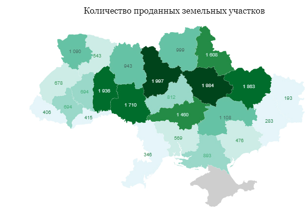В региональном разрезе за три месяца больше всего сделок провели в Полтавской области — 1889 на 4,9 тыс. га, но по суммарной площади наибольшая активность была в Кировоградской области — продали почти 8,6 тыс. га (1351 сделка). Наименьшее количество сделок провели в Луганской области (168), а в Ивано-Франковской и Черновицкой областях — меньше всего продали по площади (по 246 га).